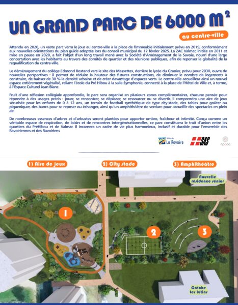 Un grand parc de 6 000 m² au cœur du centre-ville pour 2026 ! Après un long travail mené avec la SAS 73, aménageur de la ZAC Valmar et enrichi par une large concertation avec les habitants en commissions et comités de quartier, ce nouvel espace vert verra le jour en 2026, en lieu et place d’un immeuble grâce au déménagement du collège aux Massettes libérant de l’espace en centre-ville.